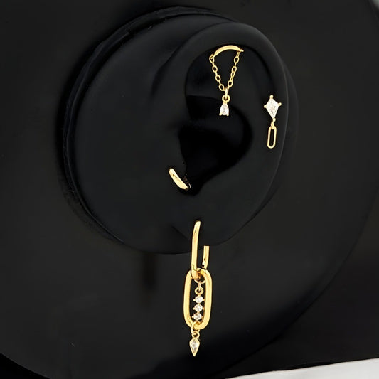 Sett med 3 Kjede Øredobber – Flatback Piercing i Gull - Helix piercingsmykker
