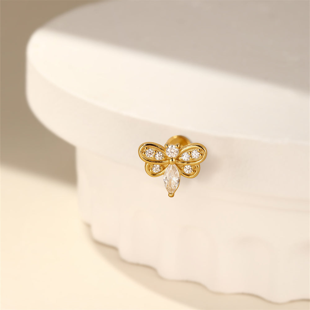 En elegant bie flatback-øredobb (labret stud) i gullbelagt 925 sølv med hvite steiner (11 × 8 mm) som gir et mykt, feminint preg. Komfortabel flat bakdel med intern (innvendig) gjenging – perfekt til ørestack og daglig bruk.