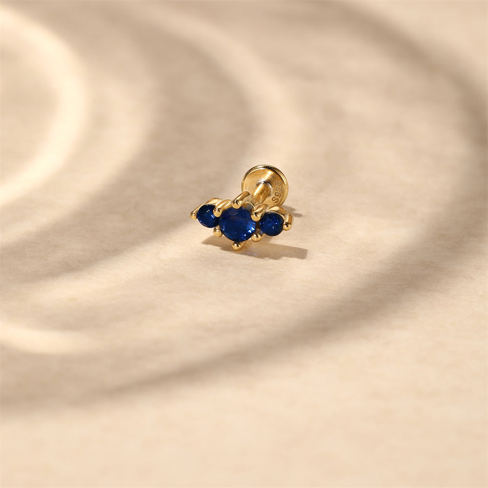 En 3 blå cz-steiner flatback-øredobb (labret stud) i gullbelagt 925 sølv (8 × 3 mm) som gir et mykt, feminint preg. Komfortabel flat bakdel med intern (innvendig) gjenging – perfekt til ørestack og daglig bruk.