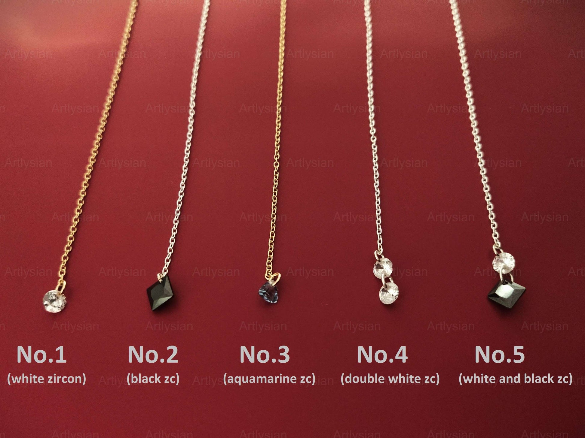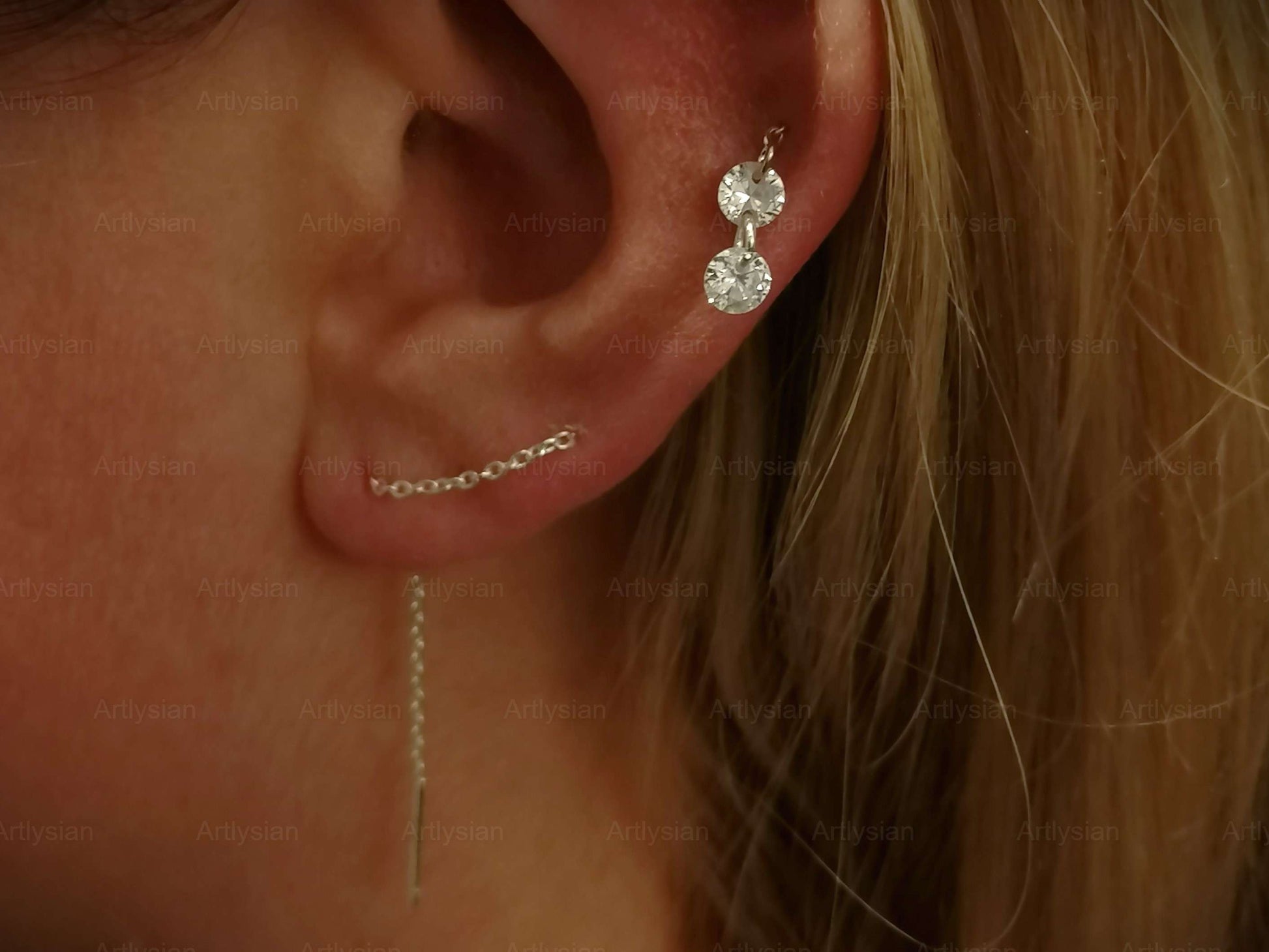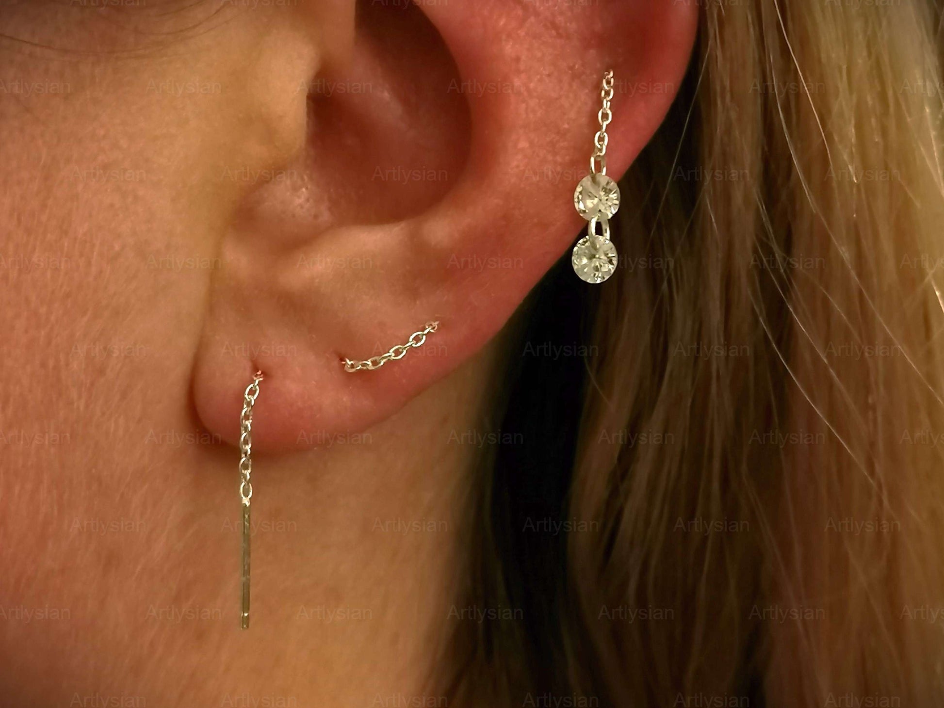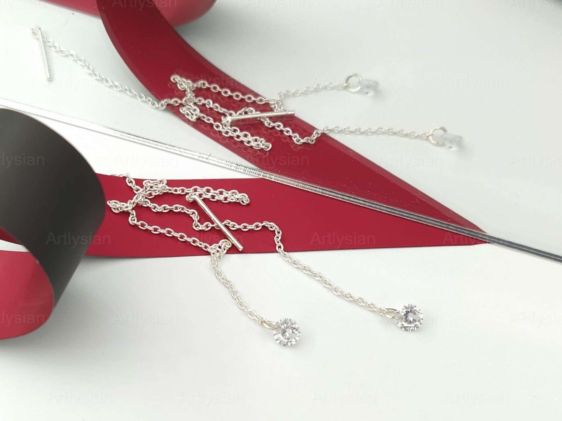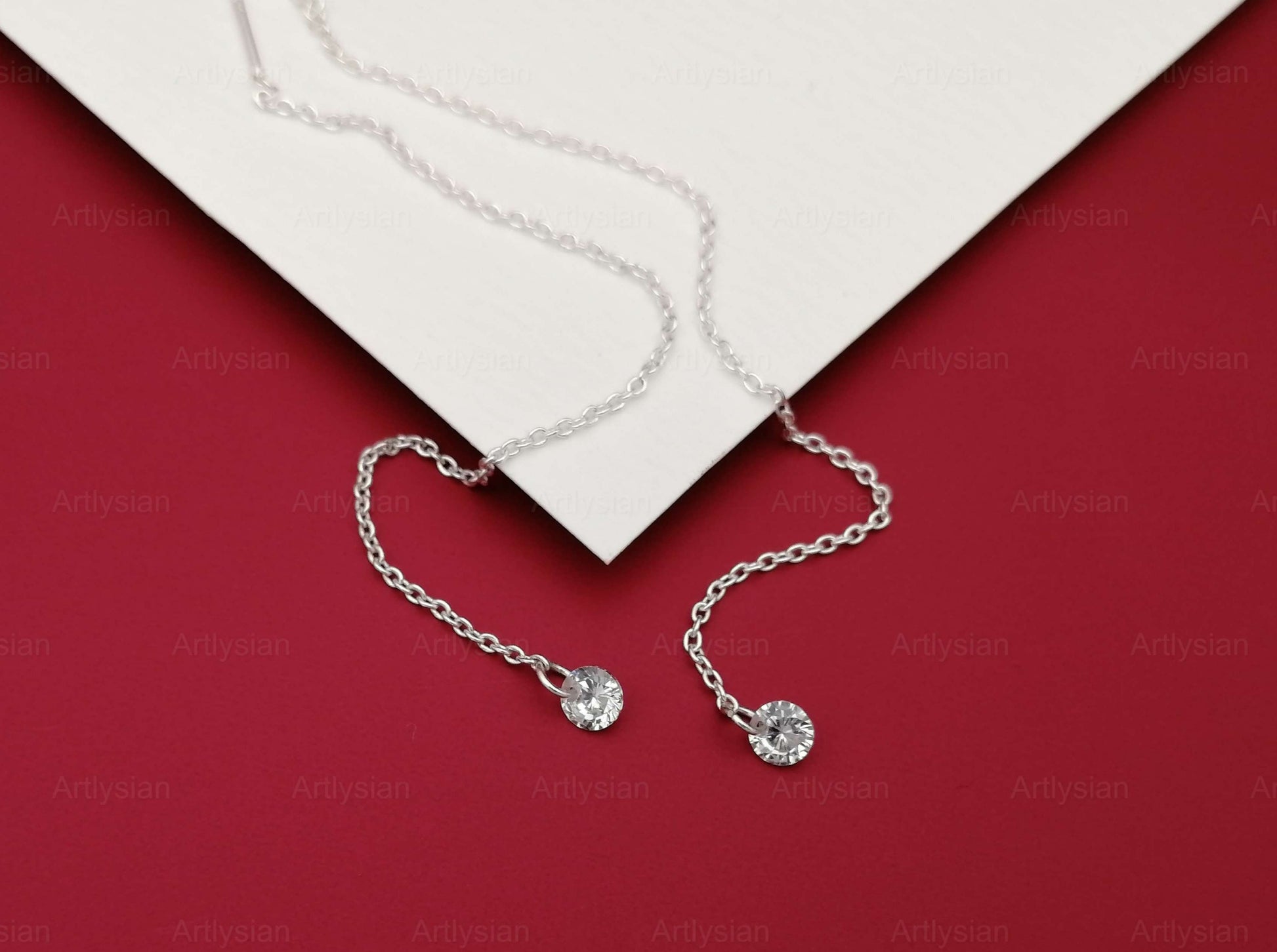 Utforsk elegansen fanget i bildene av samlingen min 'Threader Earrings Zircons'. Hvert stykke er håndlaget med presisjon ved bruk av sterling sølv 925 eller gullbelagte materialer, og utsmykket med delikate zirkoner.