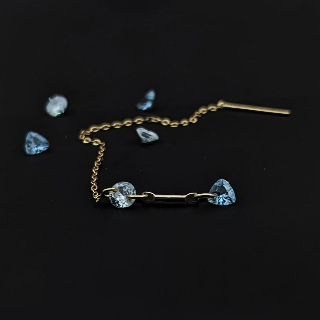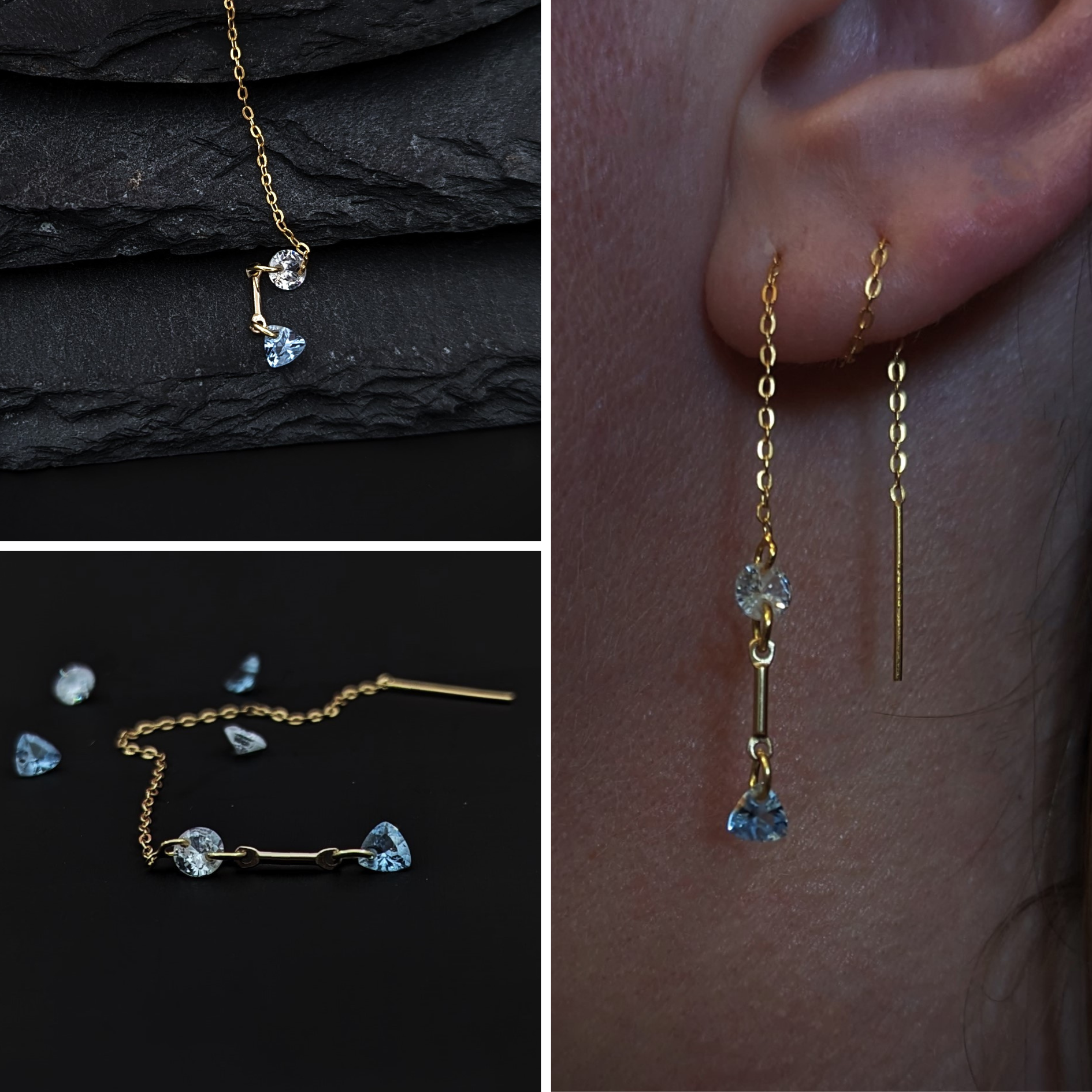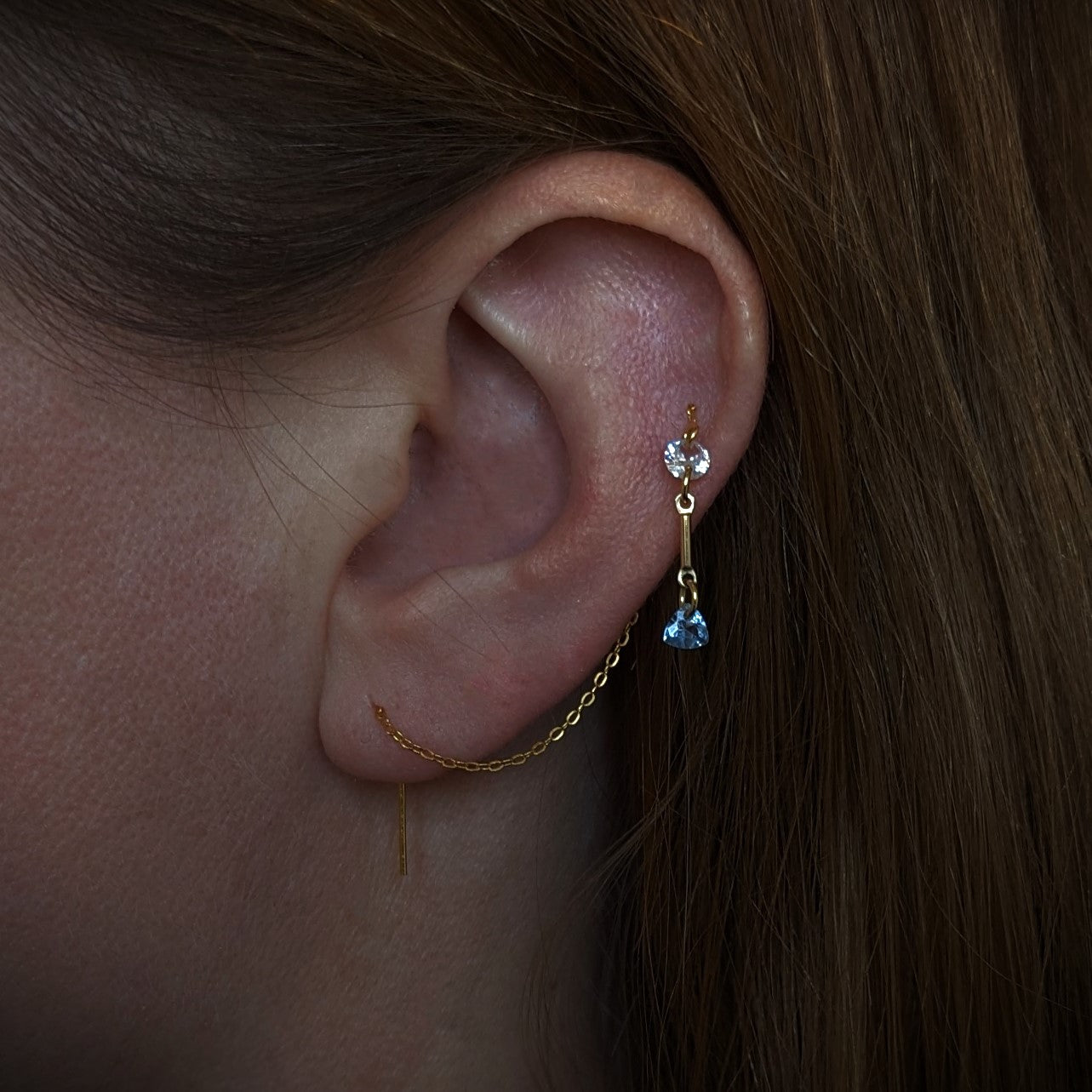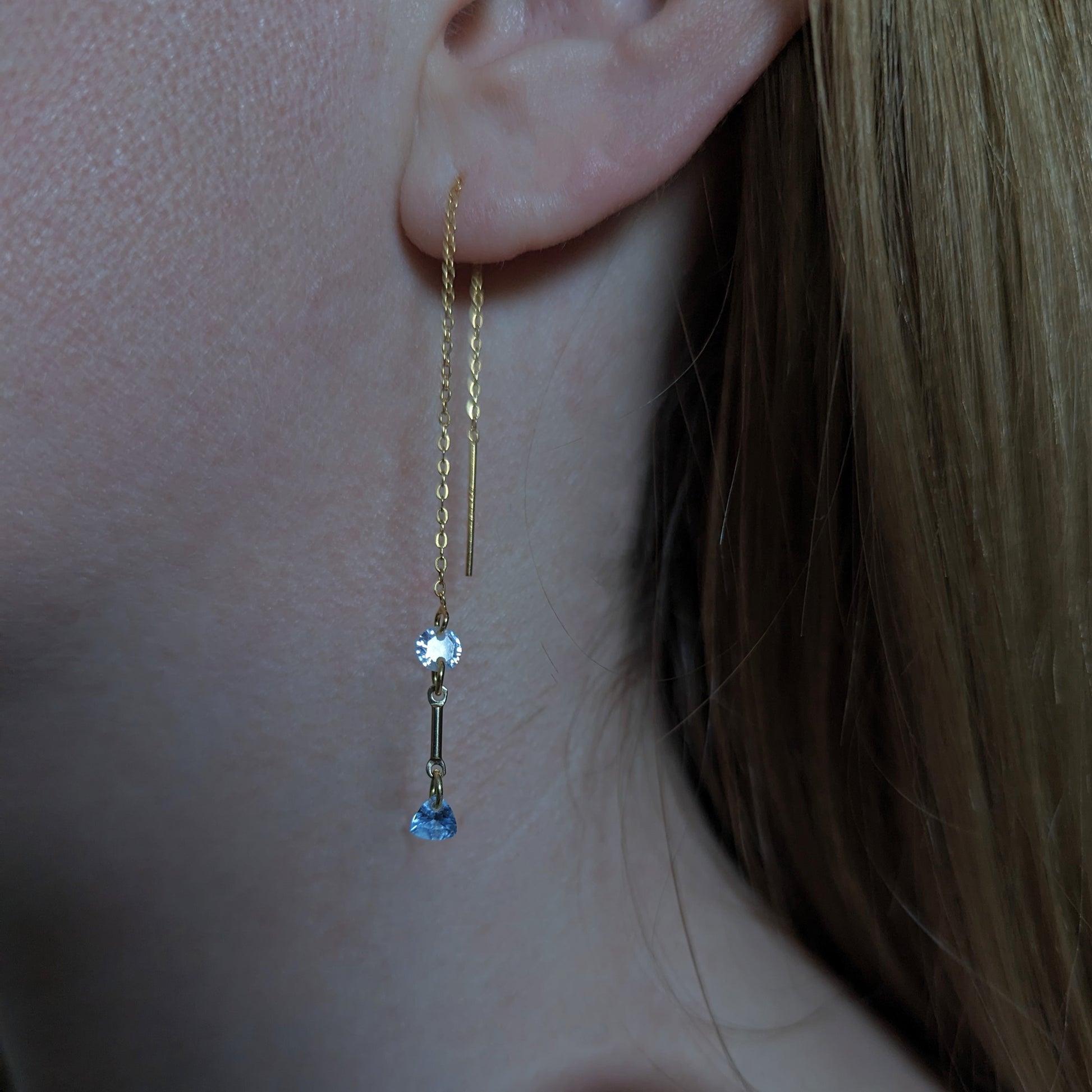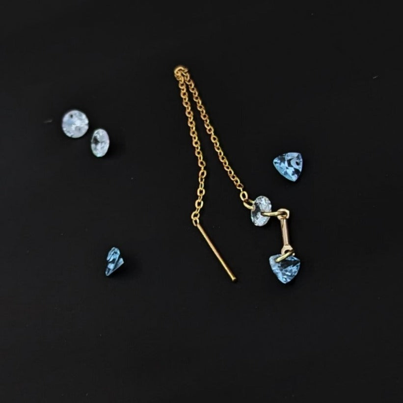 Disse øredobbene er laget med 14K gullfylte* komponenter og utsmykket med cubic zirconia steiner. Nærmere bestemt har disse øredobbene akvamarin trillioner zirkon og hvite zirkon-koblinger. Per nå har vi kun produsert et begrenset antall prototyper, og vi er i ferd med å bestemme hvilke stiler som skal være en del av det endelige utvalget. Du har muligheten til å velge en enkelt øredobber for det ene øret eller et par øredobber for begge ørene. Vær oppmerksom på at våre øredobber er eksklusivt tilgjengelige med en gul gullfylt finish.
