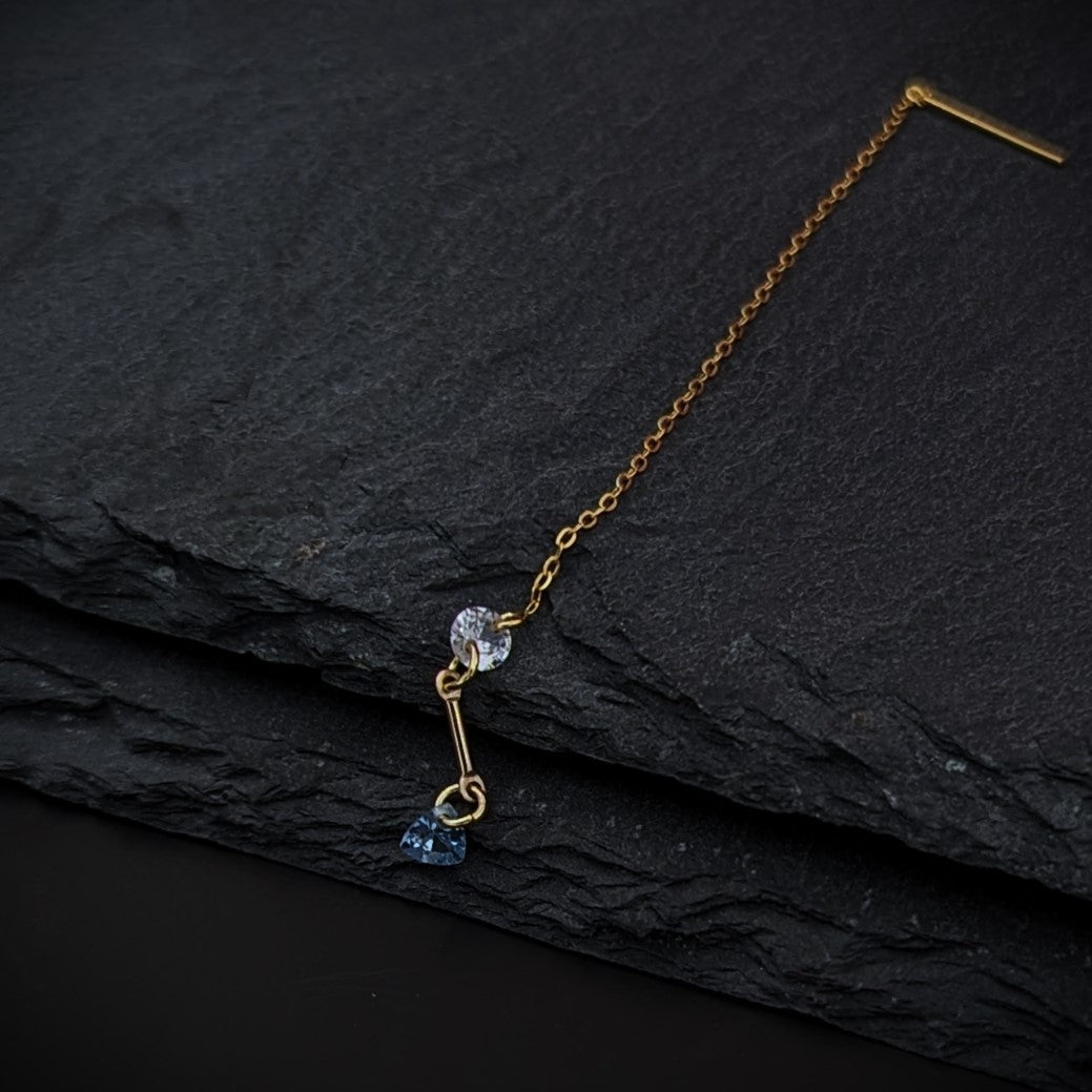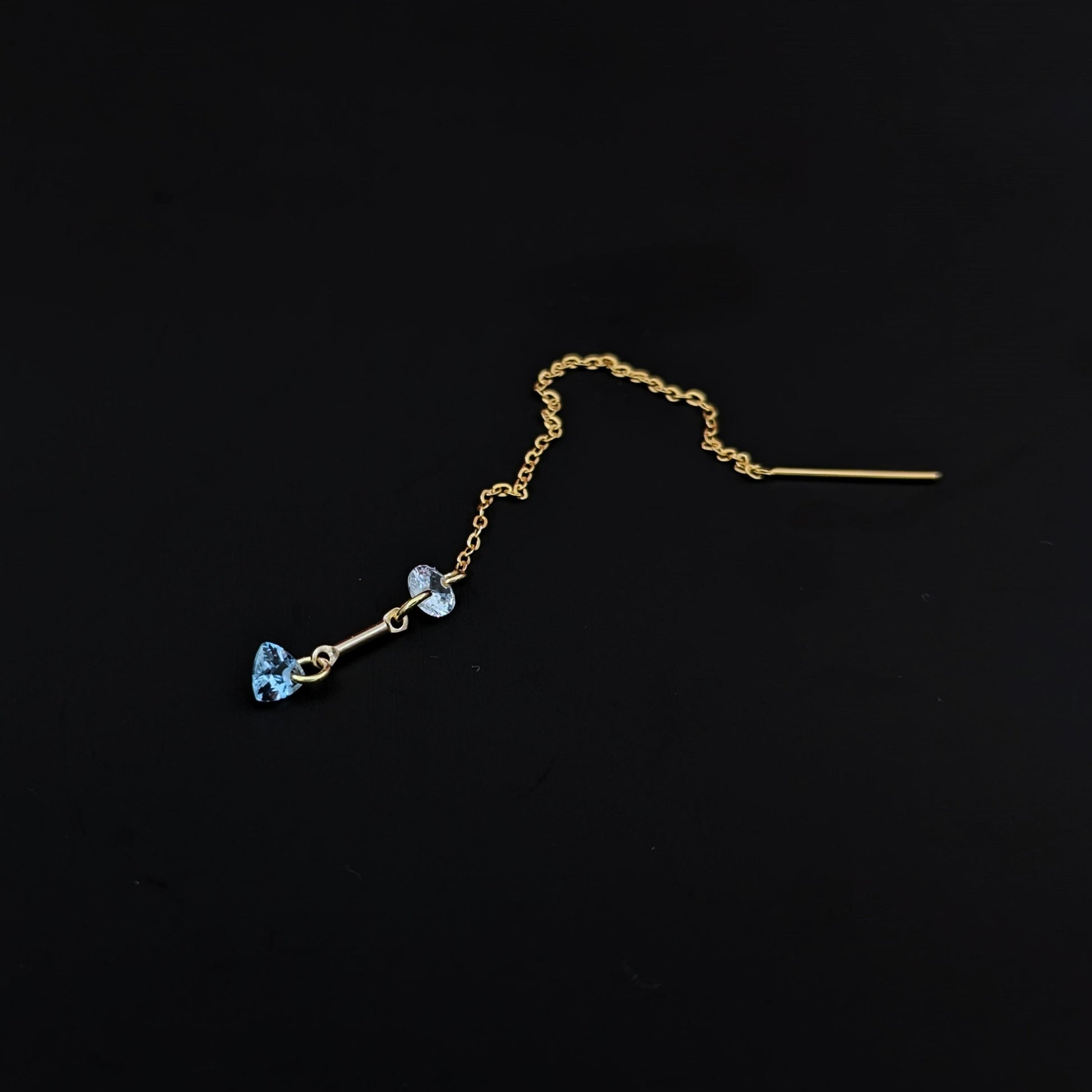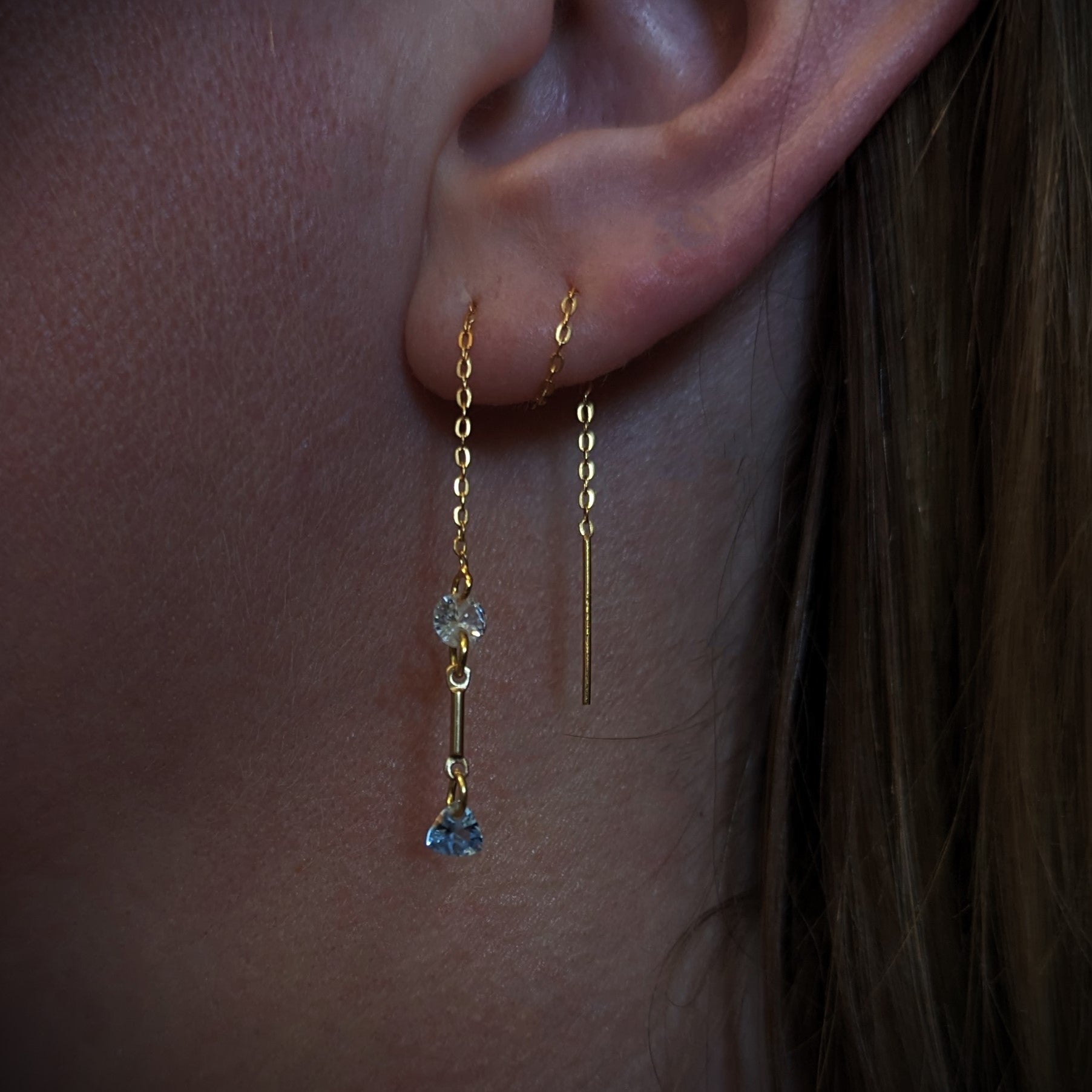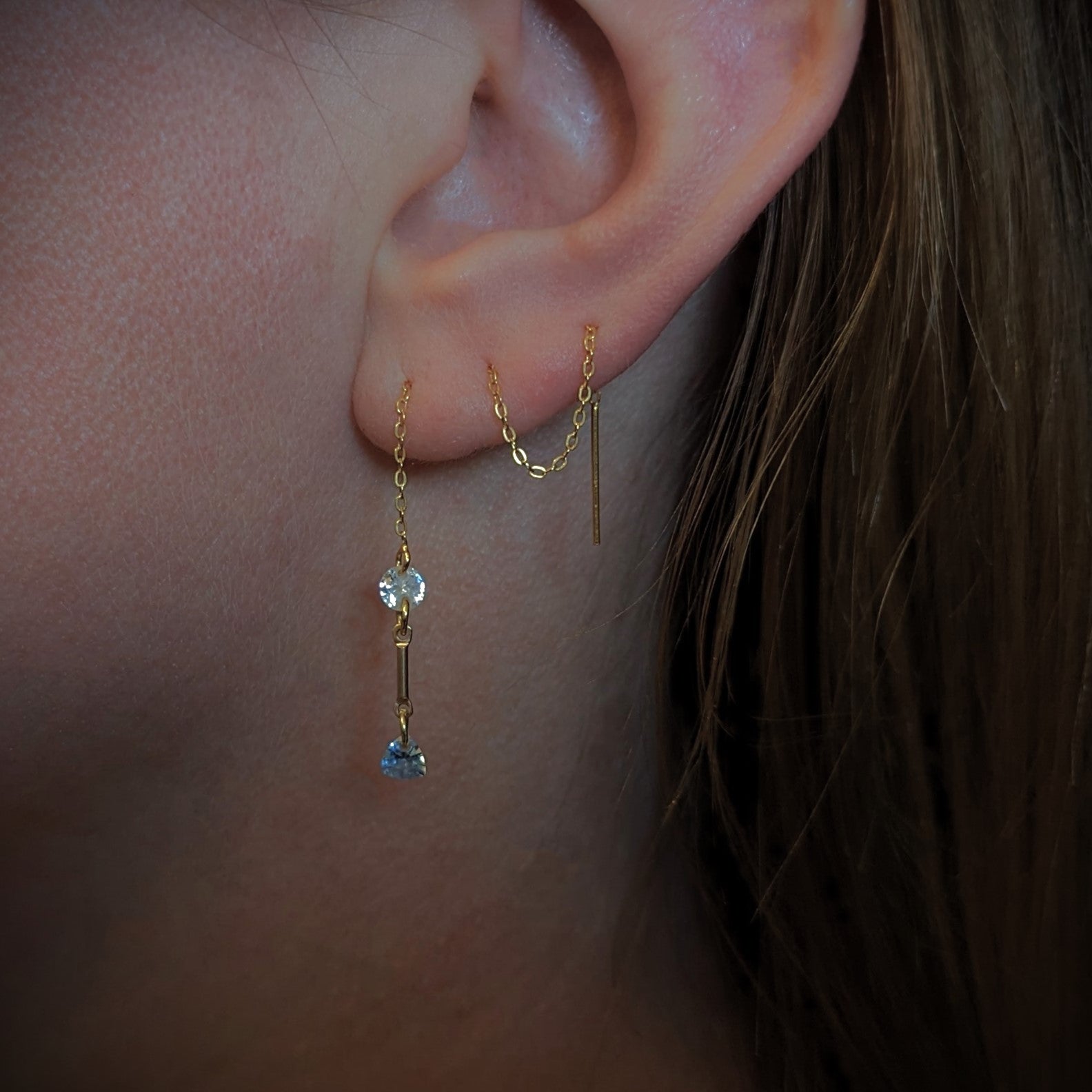 Disse øredobbene er laget med 14K gullfylte* komponenter og utsmykket med cubic zirconia steiner. Nærmere bestemt har disse øredobbene akvamarin trillioner zirkon og hvite zirkon-koblinger. Per nå har vi kun produsert et begrenset antall prototyper, og vi er i ferd med å bestemme hvilke stiler som skal være en del av det endelige utvalget. Du har muligheten til å velge en enkelt øredobber for det ene øret eller et par øredobber for begge ørene. Vær oppmerksom på at våre øredobber er eksklusivt tilgjengelige med en gul gullfylt finish.
