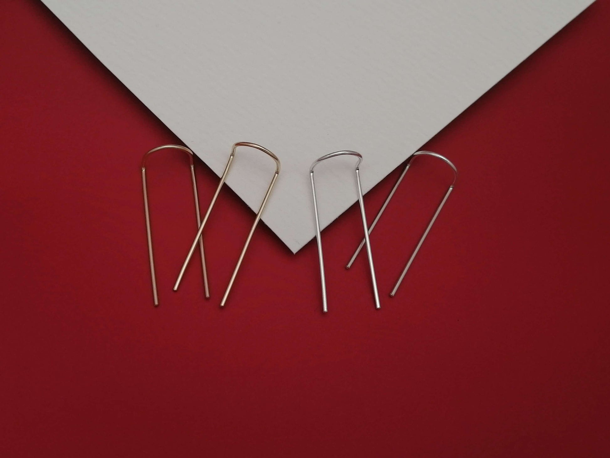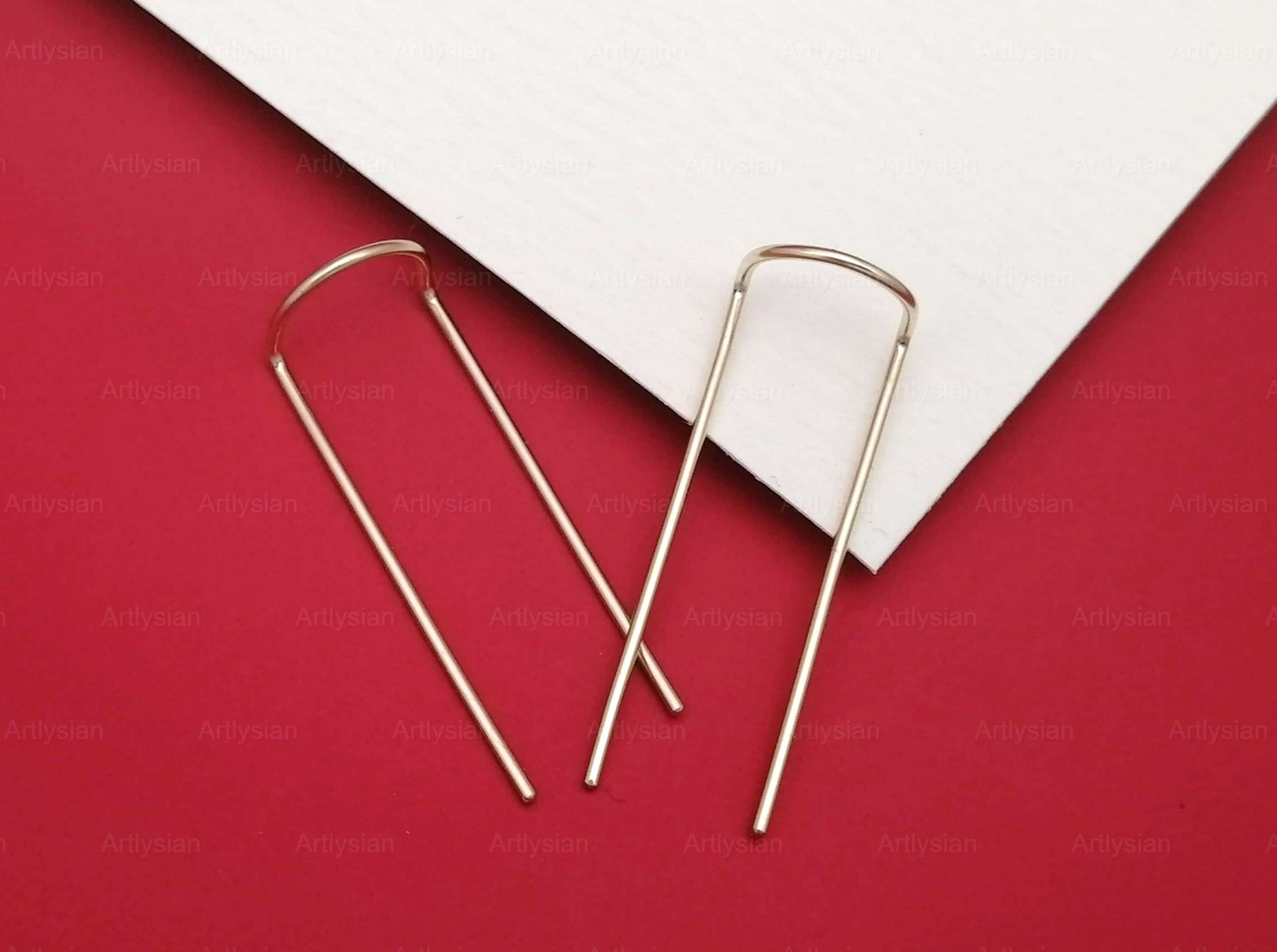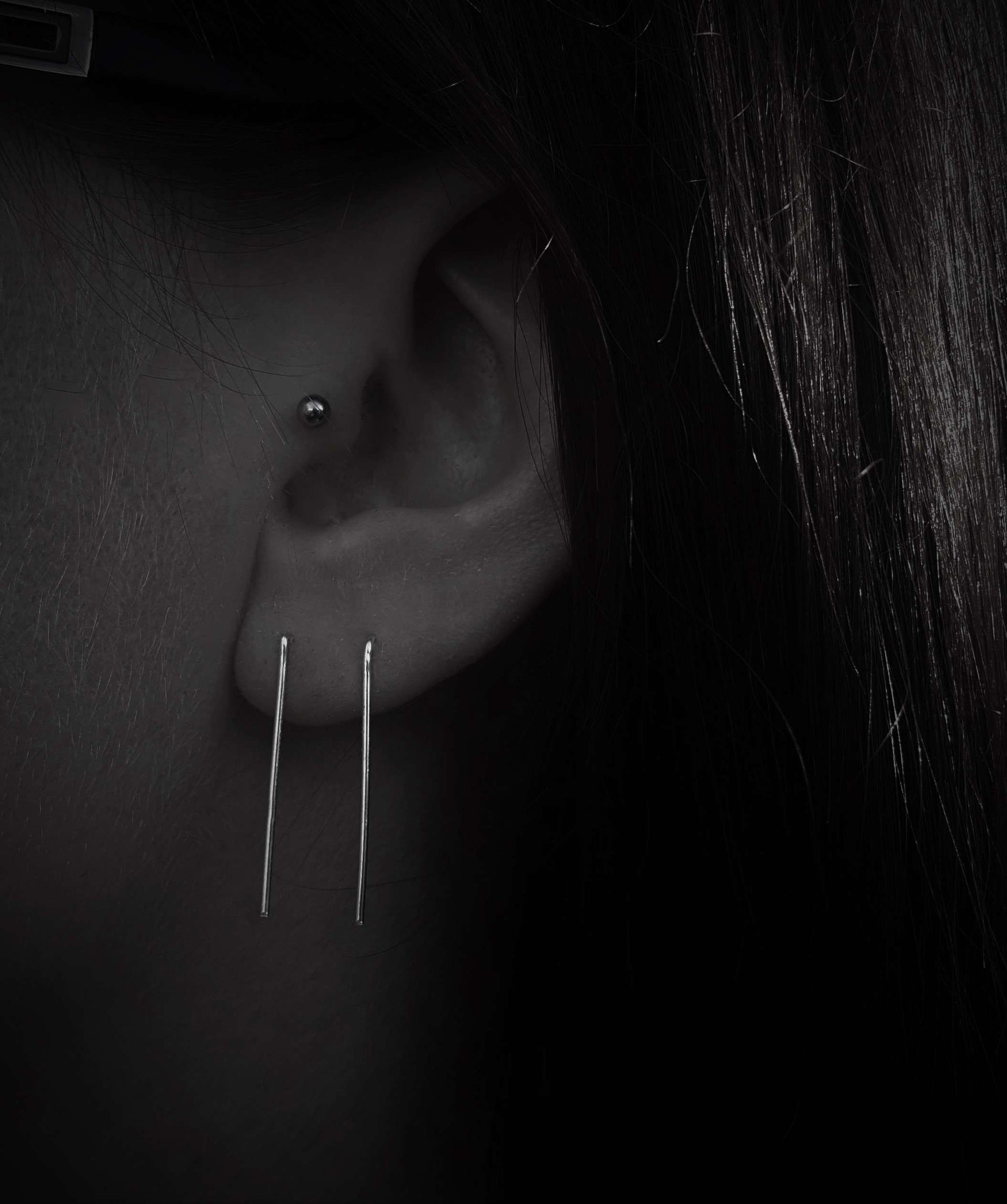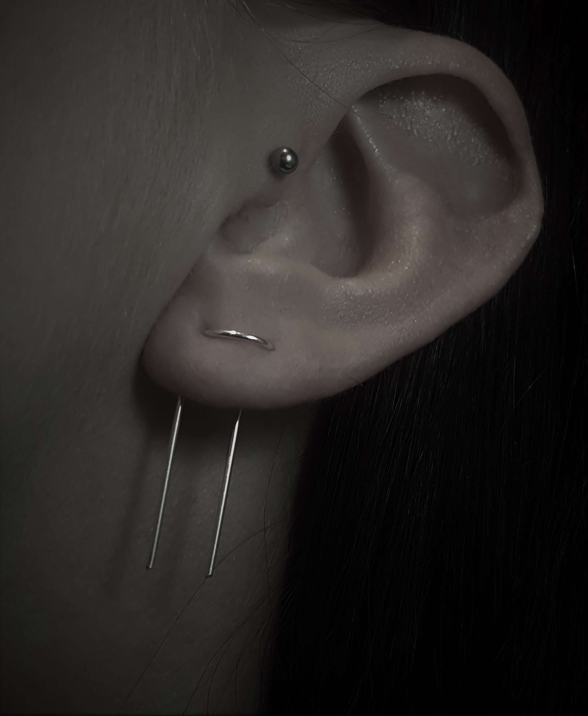 Avstanden mellom de to piercingene (hullene) måler 7 mm, men jeg tilpasser det mer enn gjerne til din unike størrelse. Bare legg igjen en lapp under kassen med ønsket mellomrom. Disse øredobbene kan bæres fra baksiden av øret for et distinkt utseende, selv om det kan kreve litt tålmodighet eller hjelp. Spesielt er det ikke behov for ekstra støtte. Du har muligheten til å velge en singel eller et par basert på stilen din.