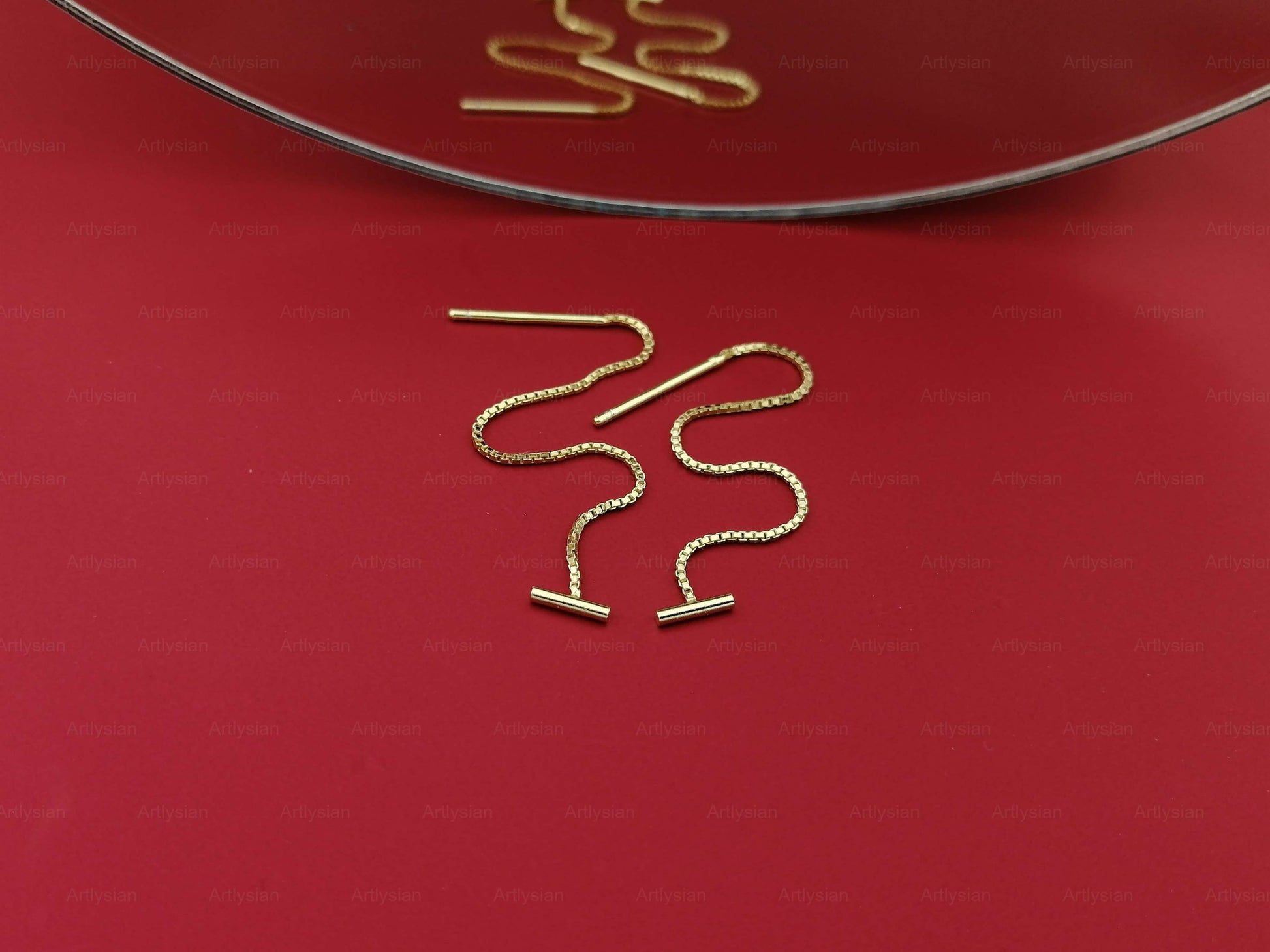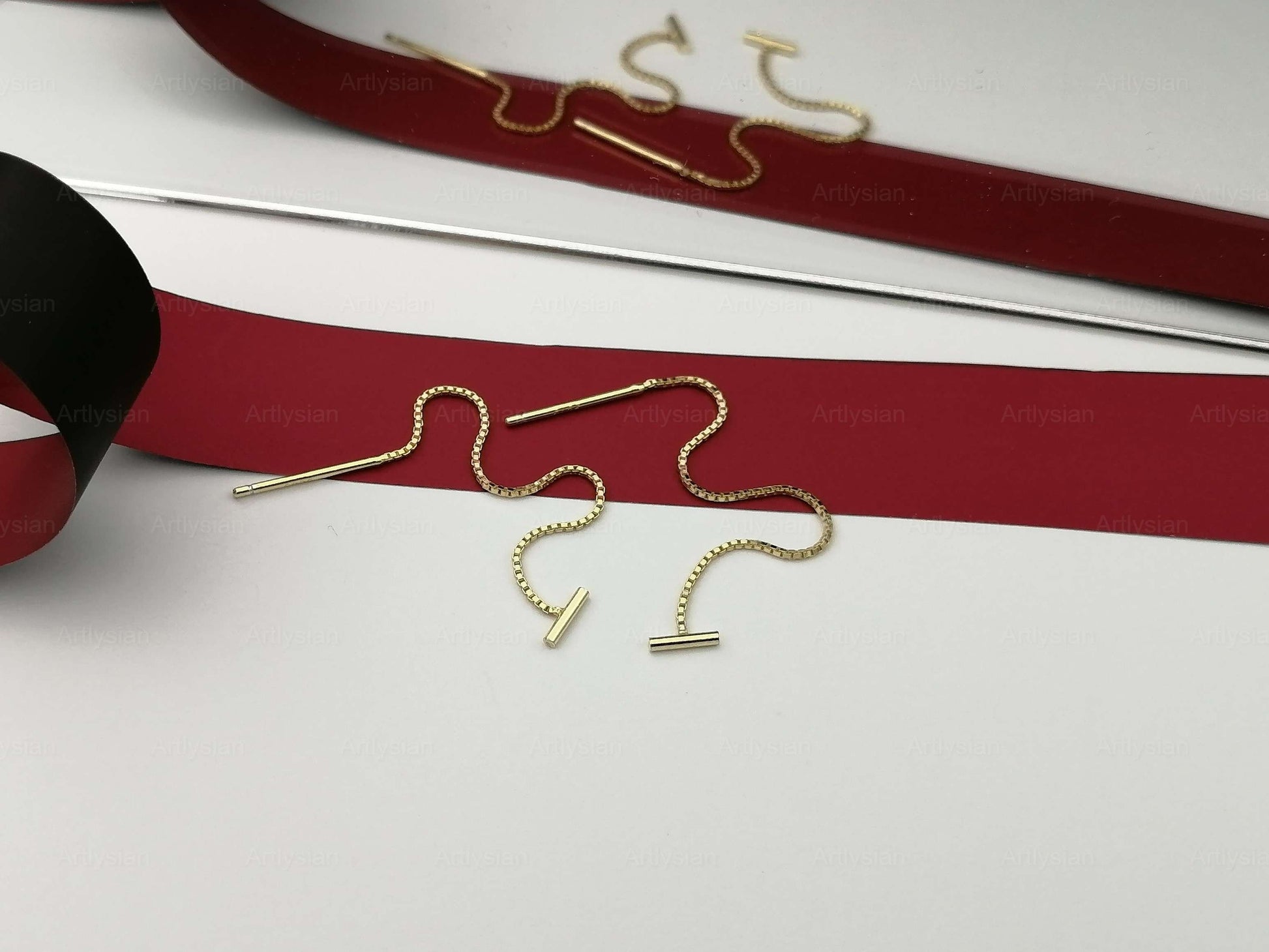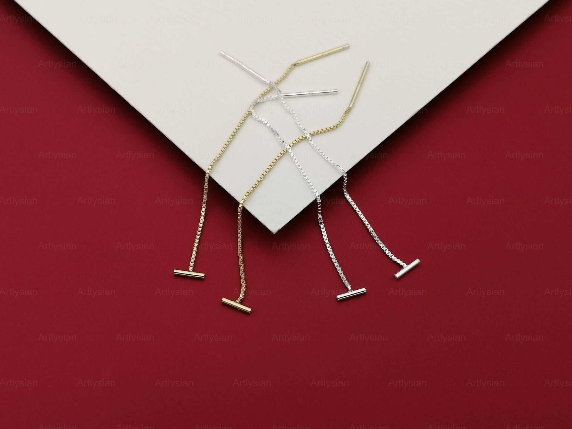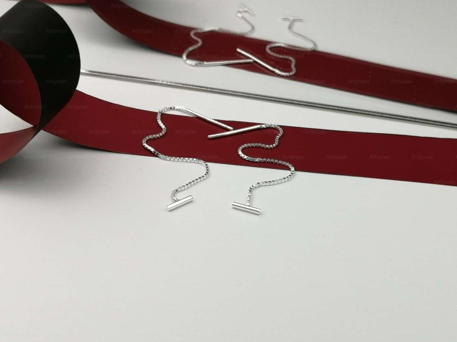 Disse utsøkte øreringene er kjærlig håndlagde, med sterlingsølvstenger og en delikat venetiansk (boks) kjede. De omfavner et moderne og minimalistisk design, perfekt for å heve din hverdagsstil.