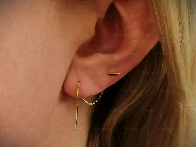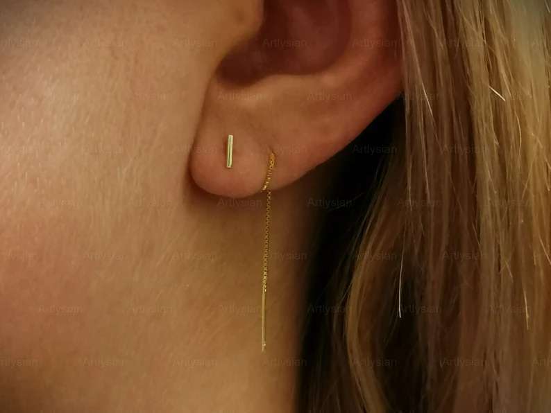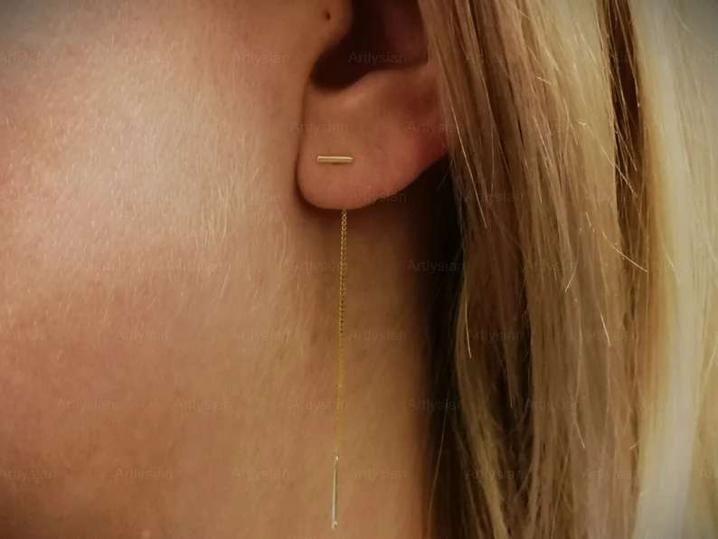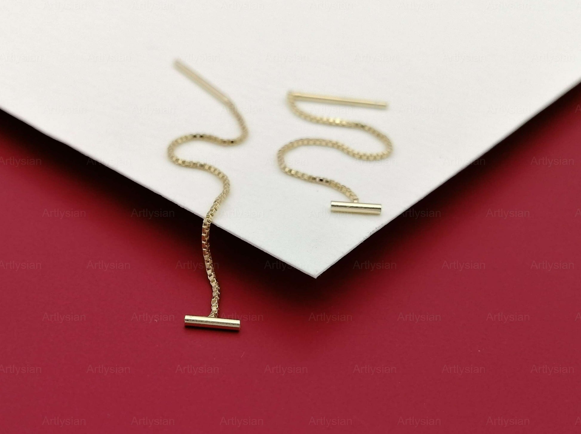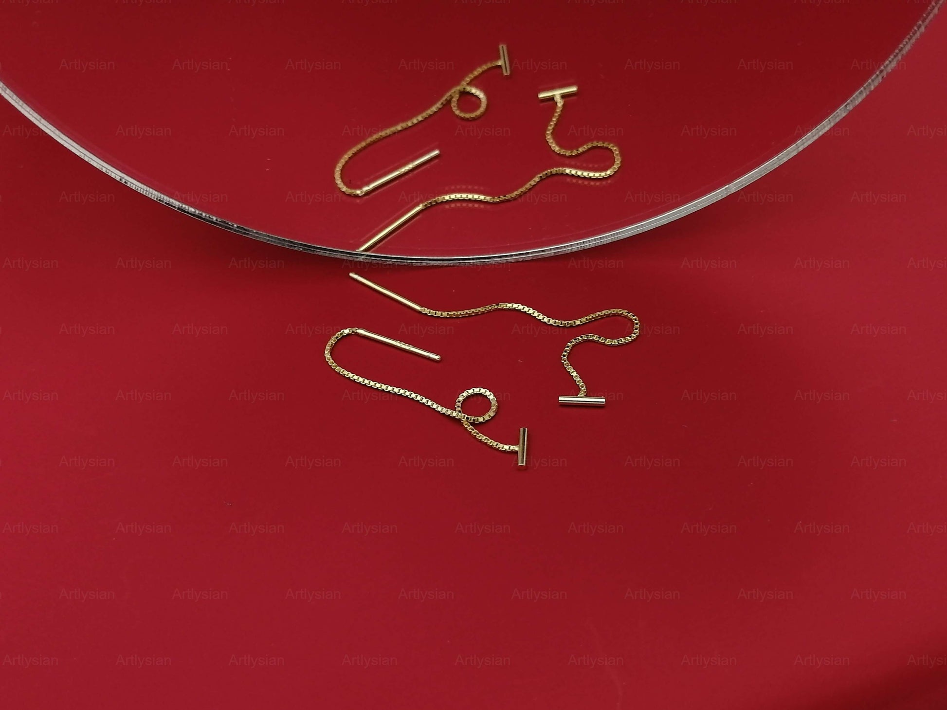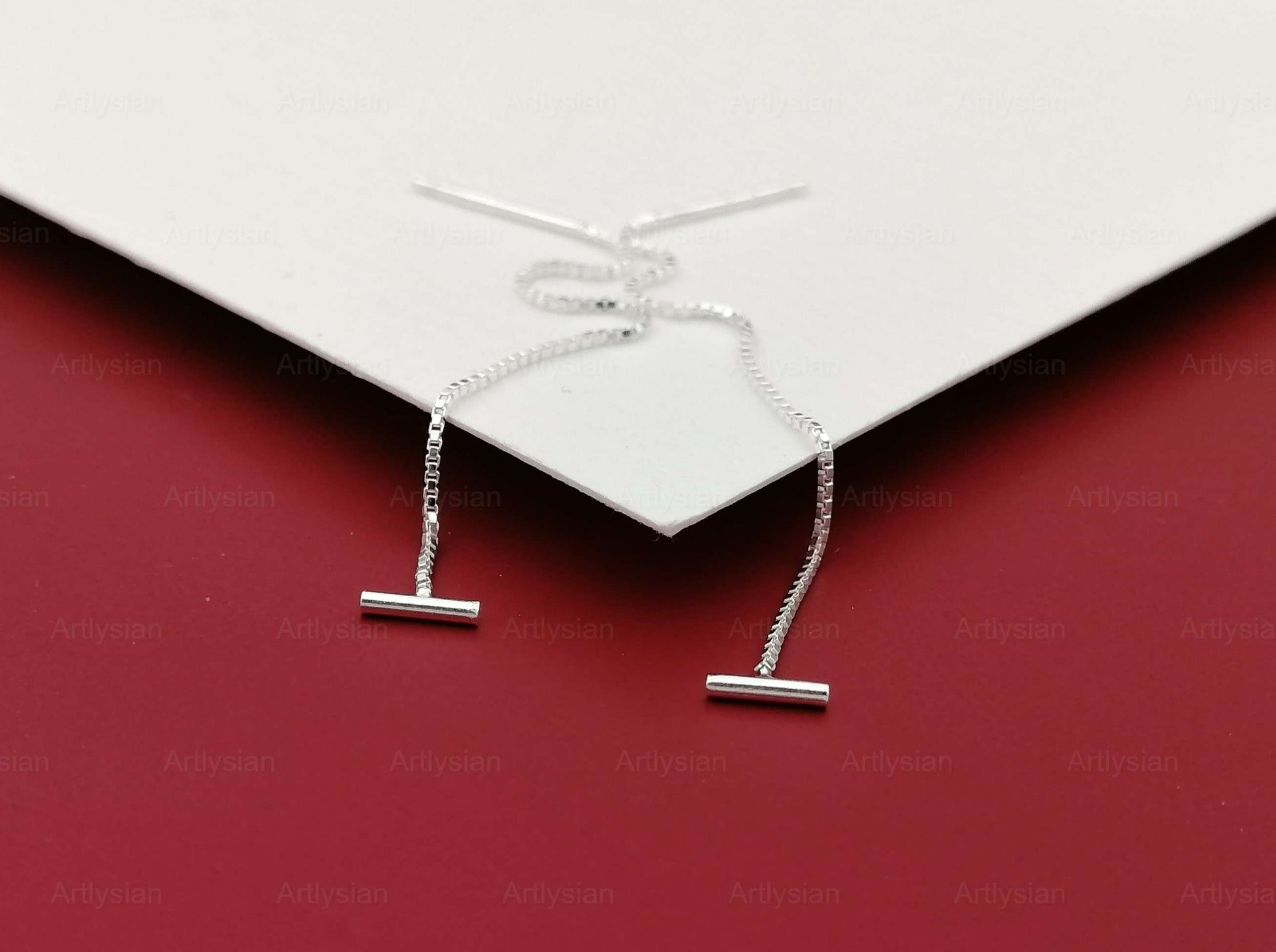 Disse utsøkte øreringene er kjærlig håndlagde, med sterlingsølvstenger og en delikat venetiansk (boks) kjede. De omfavner et moderne og minimalistisk design, perfekt for å heve din hverdagsstil.