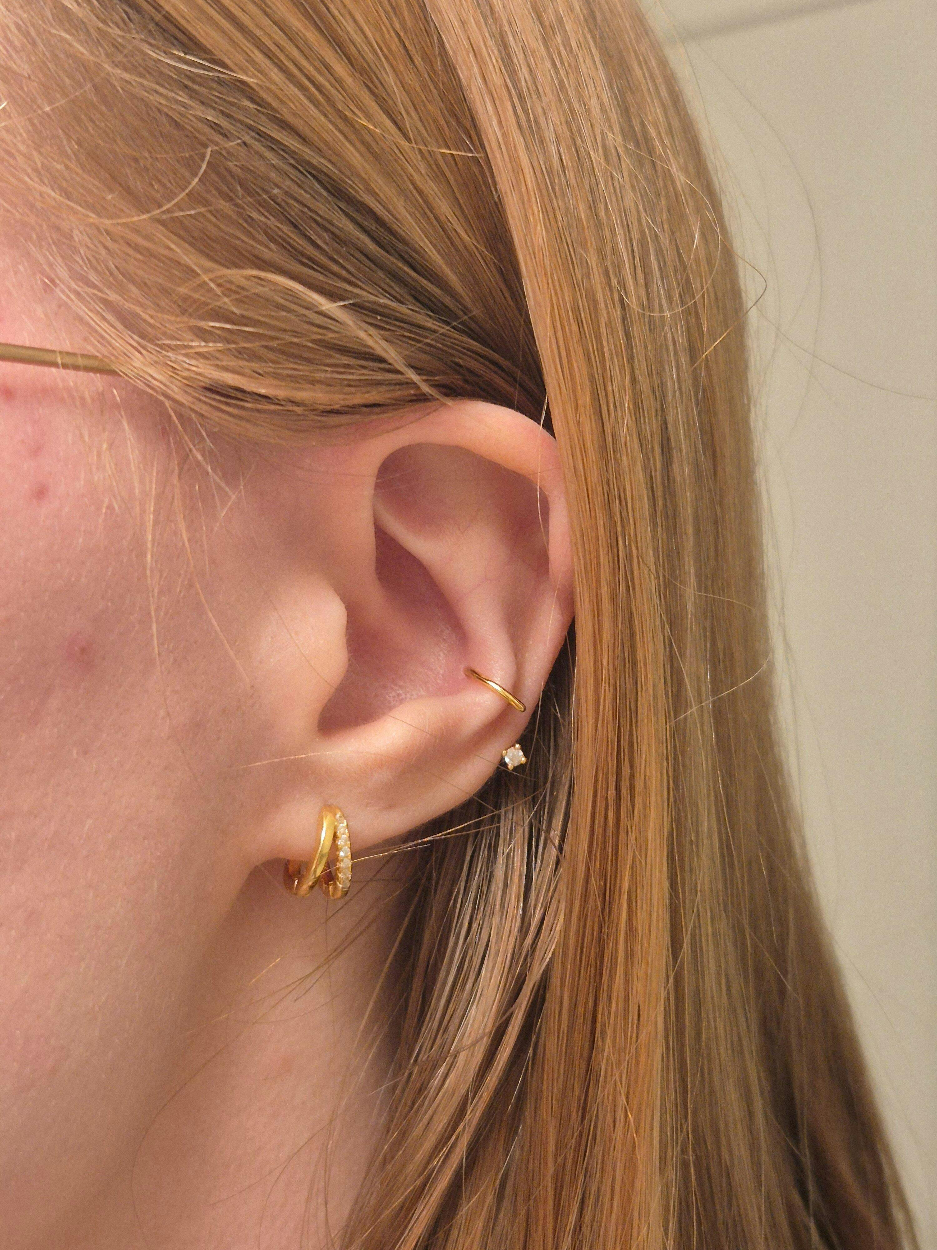 Da jeg har veldig små øreflipper sitter ikke Stella Huggie helt som en huggie på mine ører, og det ble seende noe rart ut, men den funker imidlertid perfekt som conch piercing for meg, og har blitt en soleklar favoritt der!