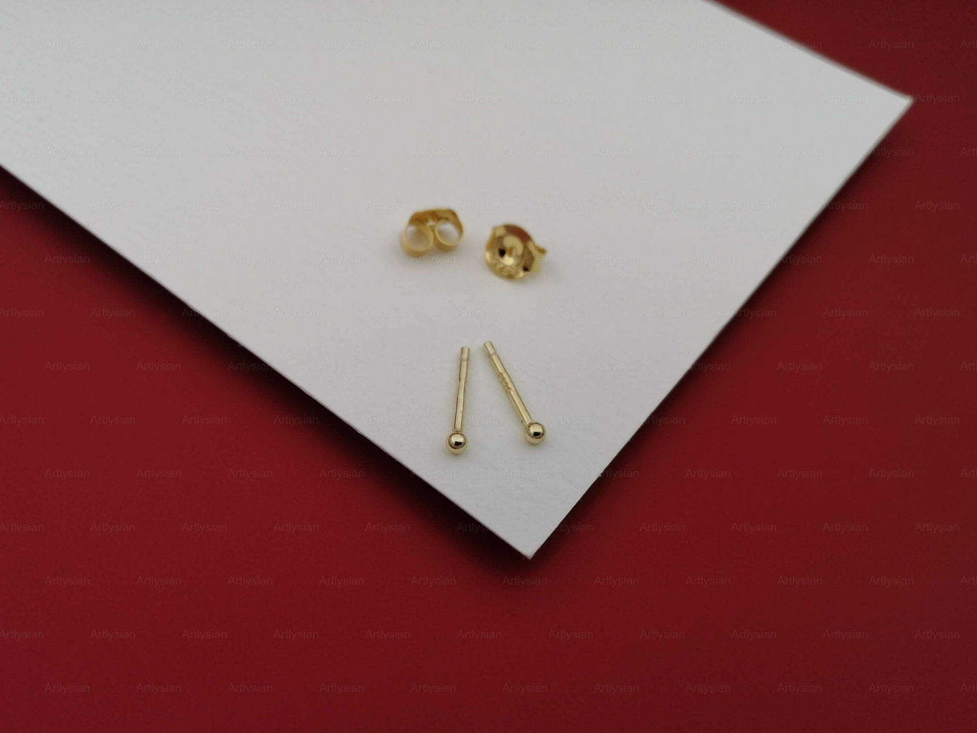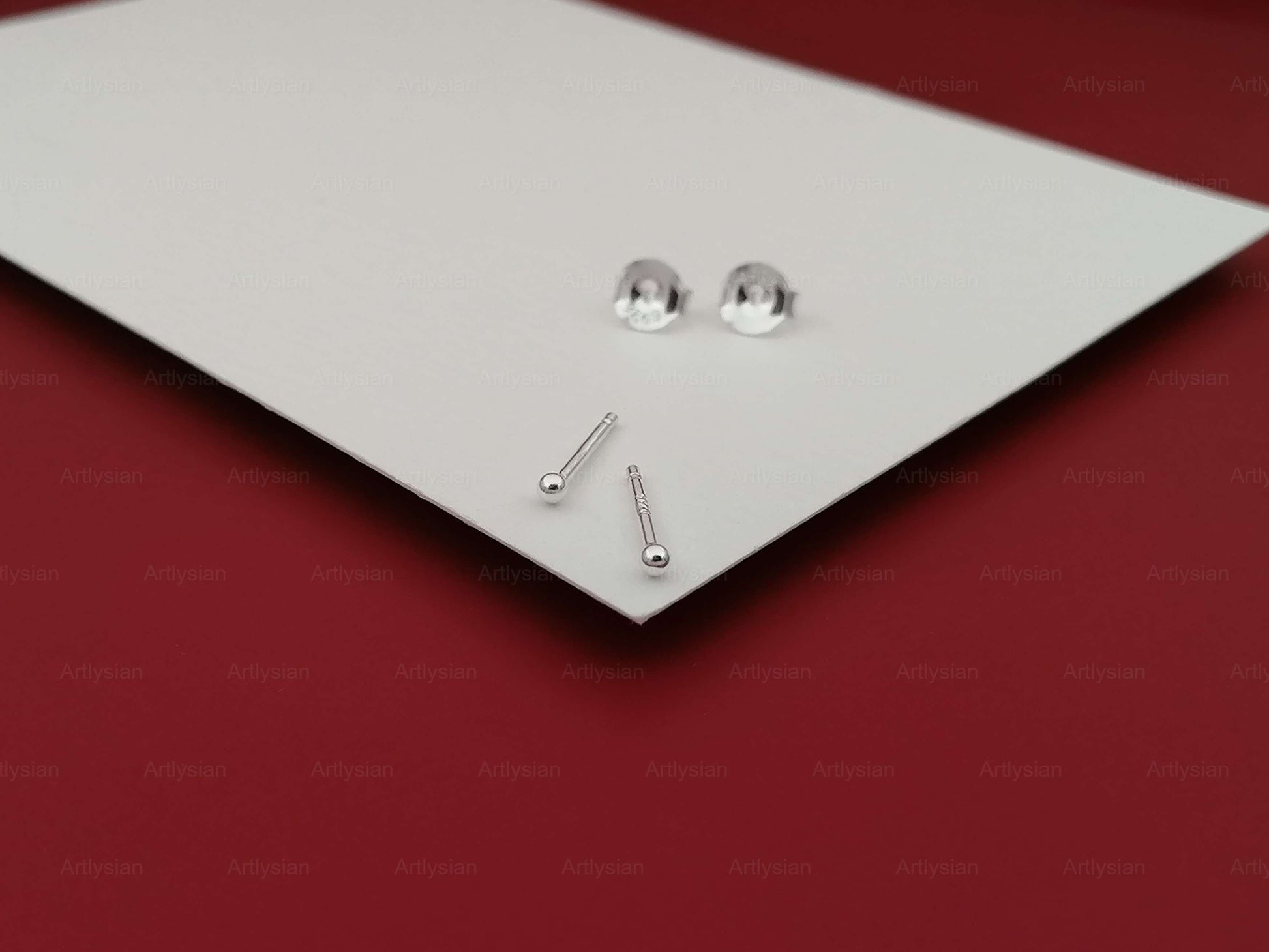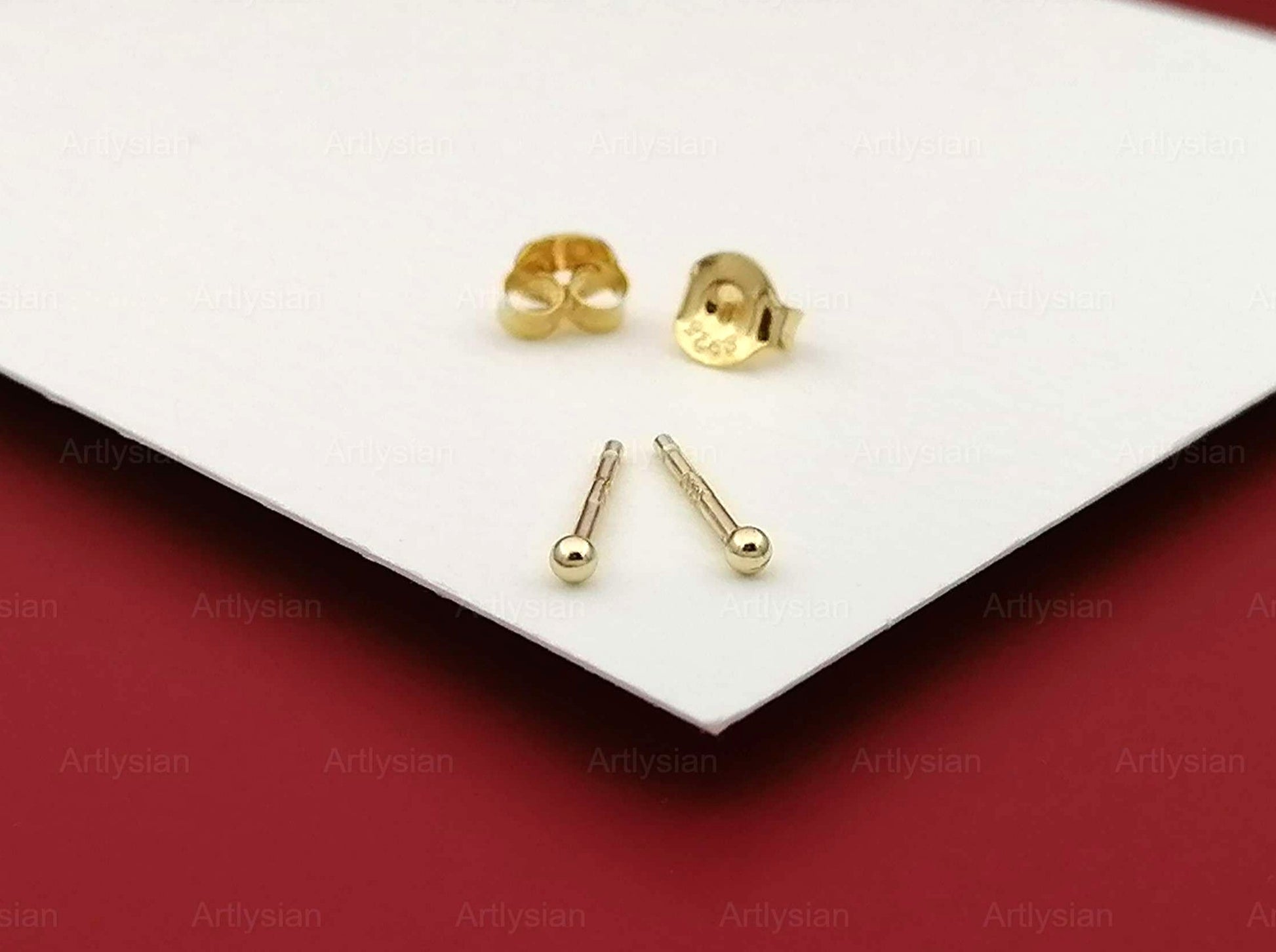 Vi introduserer vår "Tiny Stud Earrings"-kolleksjon, der diskré eleganse møter håndverksmessig håndverk. Hev hverdagsstilen din med våre omhyggelig håndlagde 2 mm kuleøredobber og bakstykker i sterling sølv, tilgjengelig i både klassisk sterling sølv og en strålende 18k gullbelagt finish.Disse miniatyrunderverkene er designet for den moderne minimalistiske, og utstråler tidløs sjarm og allsidighet. Du har valget mellom å anskaffe en enkelt øredobber for å pryde det ene øret eller et par av disse delikat utformede øredobber for å pryde begge ørene.
